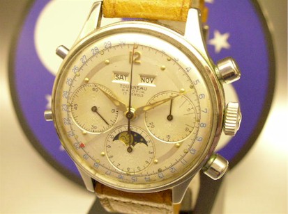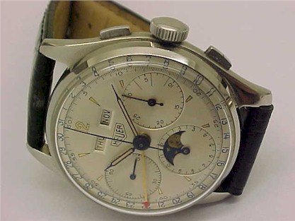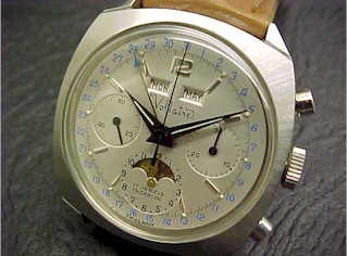 TRIPLEDATE MOONPHASES CHRONOGRAPH, VALJOUX 88 Date and day functions correct automatically past midnite. Manual correction for Month though as you are aware. Original dial with red pointer calendar hand, apertures for day and month. Three registers for hour, minute chrono registers and sub second register above the smiling moonphase. Valjoux 88 movement. Very collectible....