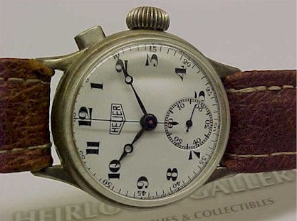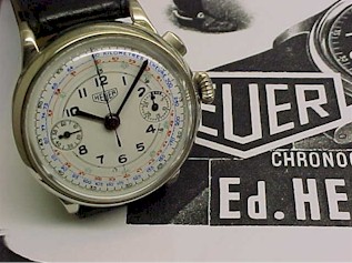 ENAMEL DIAL CHRONO, SINGLE BUTTON A very fine and rare gentleman's one pusher porcelain dial chronograph by Heuer Ca.1932. White porcelain original dial with colorful outer green, red and blue Tachymeter Graduation, blued Steel Index-Hands.30Minute Register at 3:00. 17 Jewels Movement, Caliber GHT (Valjoux).