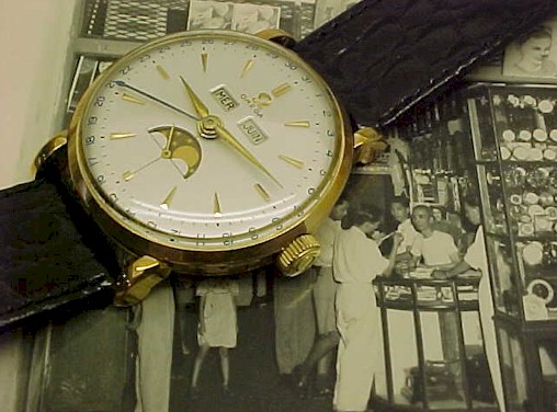 Original Silver Dial in perfect condition, Apertures for Day, Moon and Month, outer blue Date-Graduation, Ca. 1952. Unique lugs and special curved in design at case's edge. Hard to find in this excellent condition....