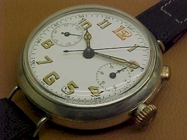 Fine and rare two registers porcelain dial vintage chronograph by Wilka Ca.1910's 100% perfect Porcelain dial in very good condition. Huge .925 silver hinged back case measures 42mm. Original single button pusher built into the original crown.