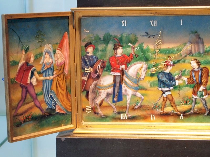 Is it a clock? A painting? Or Both? It is a beautiful piece of TIMELESS ART !!!! Well, this is probably one of "that" particular timepieces that make my heart sing!!! Can you blame me??? Look at the colorful enamel dial & panels which are fully decorated with intricate details, so rich, so bright, so refined & exquisite !!!!! Enamel clad figure decorated doors (4 panels) that open to reveal an enamel triptych interior. The beautiful dial with very nice scenery is adorned with roman numerals & special hand sets. Black Belgian marble base. H 6 1/2", W 3", L 7 1/4". It runs 8 days on each full wind . Chimes every half hourly & hourly & when it does, you see me smile......yes ! My heart sings !! No words can describe this special item accurately, so I will let the pictures do the talking (the last two pictures amplify the desire to sing louder) ........very nice !! These particular models of painted enamel clocks represented the best examples that could be offered at the time. Not only did the manufacturer take the time to make sure that each of the panels were decorated on the inside, they decorated the outside panels as well. ONLY 2 OTHER EXAMPLES HAVE EVER BEEN HANDLED BY ANTIQUORUM, THAT IS HOW RARE THIS IS and may indicate that these were made either for a special exhibition or on special order only. The second piece by Antiquorum was auctioned for HKD237,500!!! approximately SINGAPORE$46,000 on 25 June 2011.