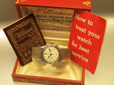 D/ Mint condition dial with black details. Original hands set. Subsidiary seconds register at 9:00 position. 30 minutes counter at 3:00. C/ Original mint condition stainless steel snap back case with sharp & crisp edges. Fully hallmarked & signed. Measuring only 28mm excluding crown. Original crown and olive pushers. I just LOVE the rotatable bezel with engraved numbers 1 to11 with a black triangle at 12:00 position. M/ Original Witntnauer signed Mechanical winding valjoux 69 movement. NEW OLD STOCK + ORIGINAL PRESENTATION BOX + ORIG GUARANTEE CARD + BOOKLET EXPLAINING THE CARE NEEDED . . . AS COMPLETE AS THE DAY THIS LITTLE BABY WAS BORN...