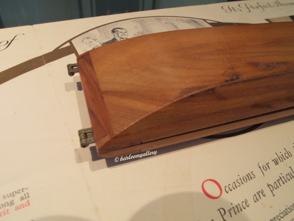 PRECIOUS PRINCE WATCH An extremely RARE, super hard to find Rolex watch box for your beloved PRINCE watch. When was the last time you see a WOODEN ROLEX PRINCE BOX??The beautiful box is made of wood with beautiful grains. Hinged in the middle with old metal hinges. Flip it open and you will see a Silky material on the top inner cover that is signed ROLEX WORLD'S MOST ACCURATE WRIST WATCH. The silky material is still in very good condition, given its age. The bottom part of the box is lined with maroon red velvety material with a opening slot to display your beloved PRINCE watch. Look closely and you will see the nice detailing at the edge of the bottom box, in gilt finish, giving the box a FRAMED look. Very nice attention to details. The box hinges at the back & the unique hinges allow the box to stand upright when opened to display your beloved PRINCE handsomely & proudly too. With this box, your Prince watch will become a PRINCE CHARMING, no less....... Very rare too. Perfect companion for your Prince watch. Top it up with the super rare PRINCE Catalogue shown above !! ref