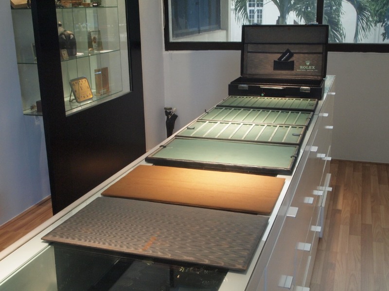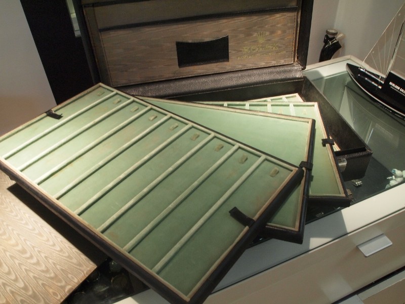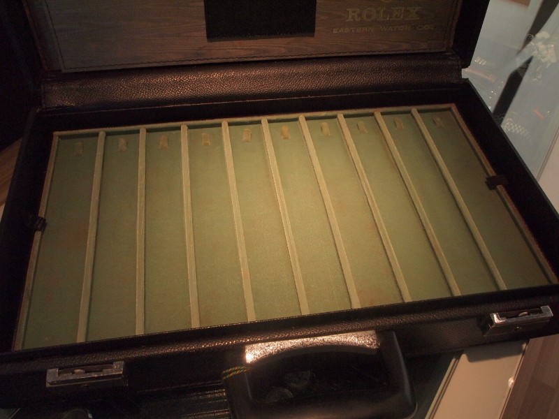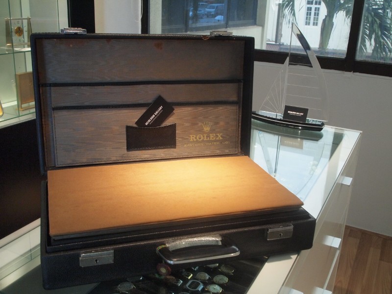 An extremely rare vintage ROLEX Briefcase with watch holding/serving trays for all your rare watches, ROLEX or otherwise!!!! Hard leather briefcase with 6 different trays housed into one place. 3 trays to hold watches 31 watches, 1 serving tray and 2 separators. All made of high grade vintage velvet/suede material typical of the past era. Now you can carry/store your beloved watches in one place and impress your friends when you pull out the individual trays of watches at one go. The feeling is: SHIOK . . . . PRICELESS !!